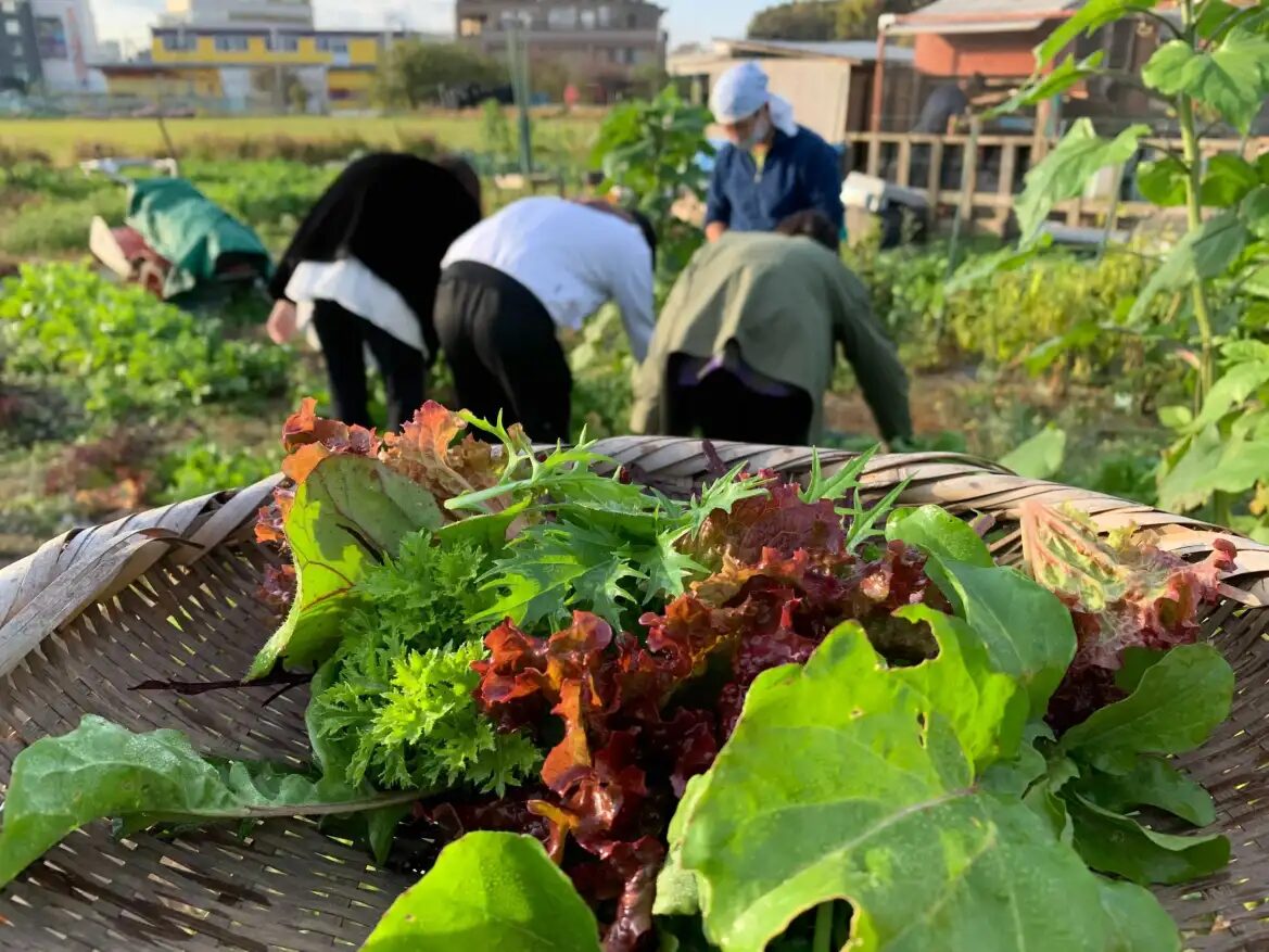 畑で無農薬の野菜やハーブを収穫し、