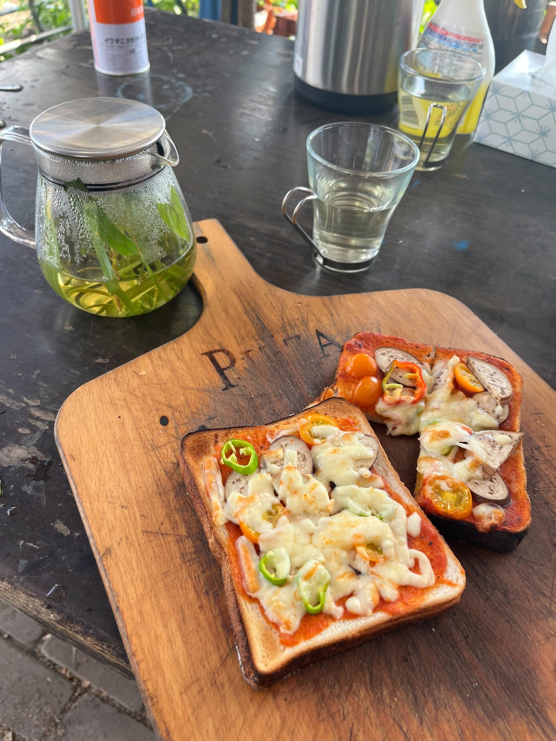 ピザ窯(※¹)で焼く採れたて野菜のピザトーストと、ハーブティー(※²)をいただきます。